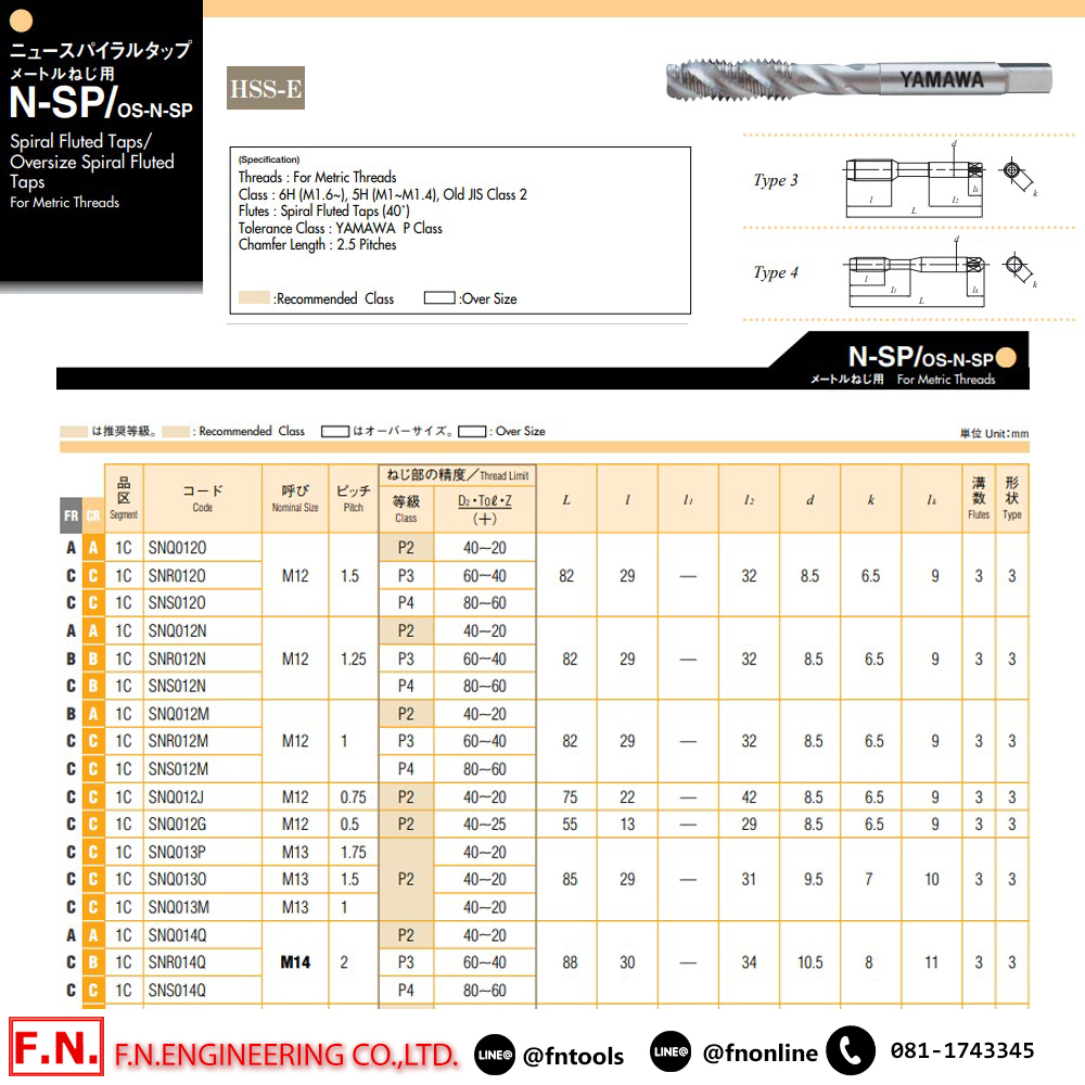 • YAMAWA SNQ012N ต๊าปเกลียวสว่าน N-SP M12X1.25 P2